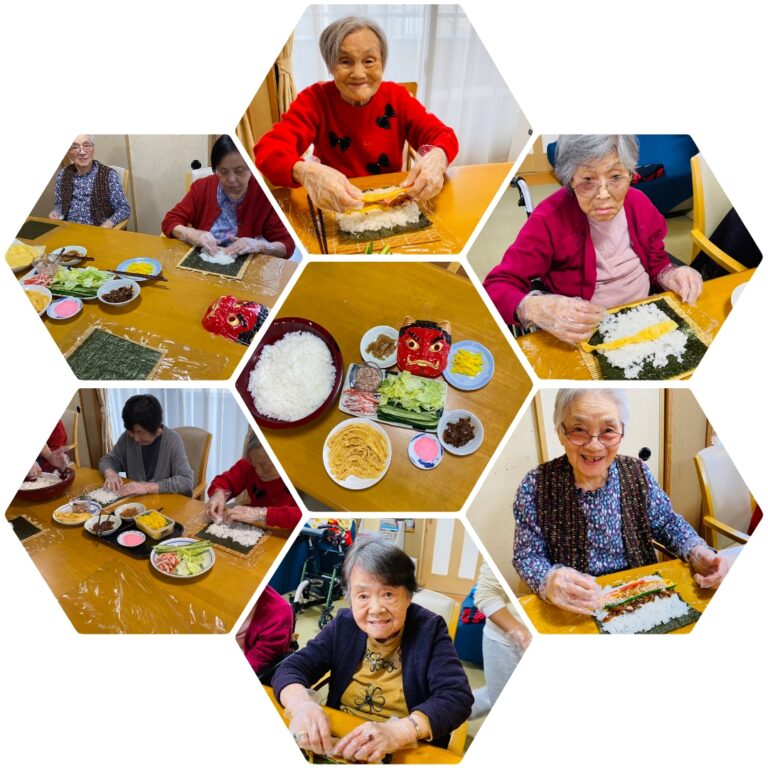 ご利用者様それぞれお好きな具材を選んで作りました👹 皆様とってもお上手に作られ、今年も元気に楽しく過ごしましょう😄と お願い事をして、美味しい恵方巻を食べました(^_-)-☆ (GH桜丘) -